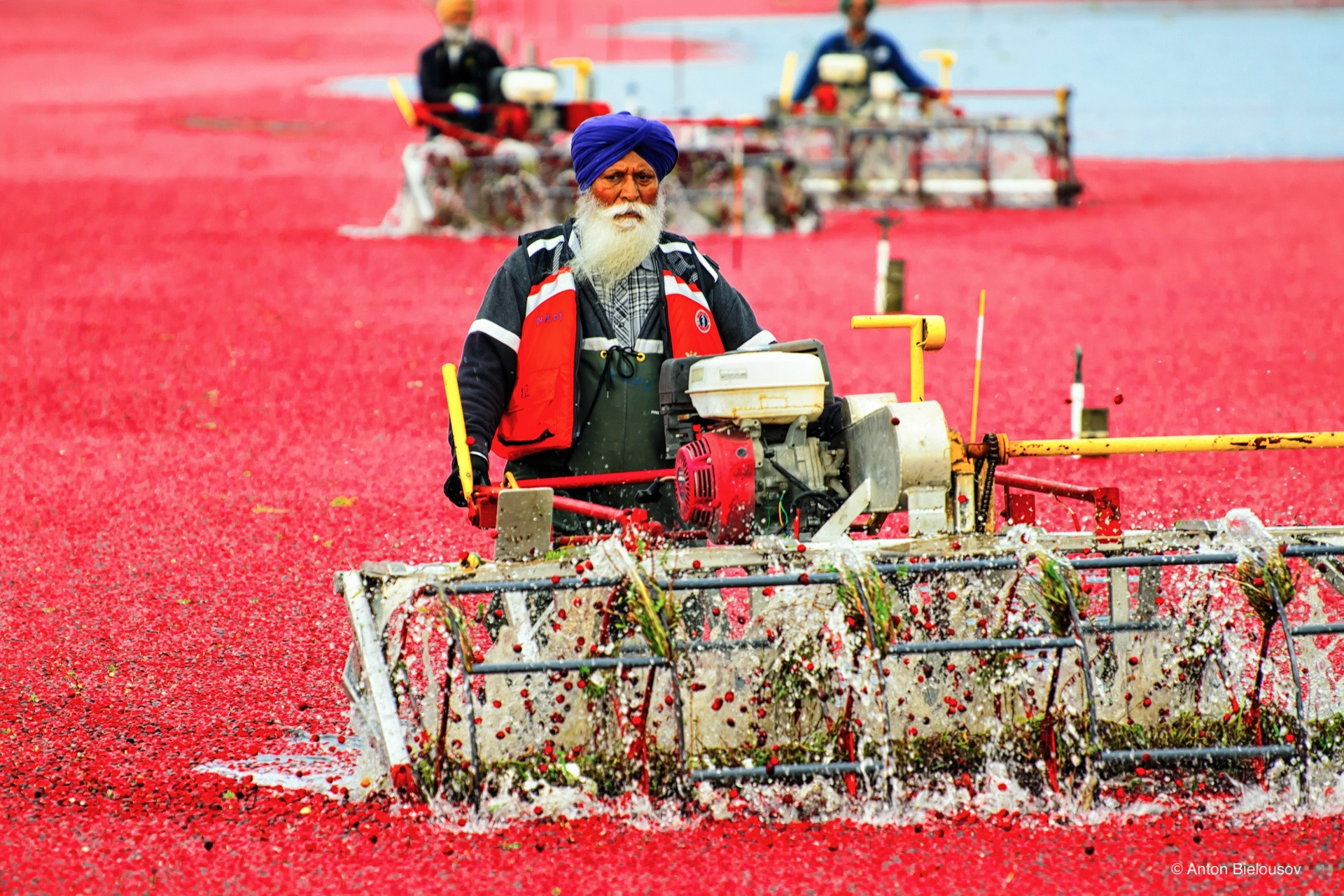 Because it looks like a scarlet ocean across the bogs. And you see people in waders, booms in the water, trucks waiting to scoop them up — it’s theatrical. But also, since this is Canada and apparently certain communities have a harder grip on the industry than others, it is not uncommon to see people wearing in their national clothes, which makes the look of it utterly surreal, as close as in Vancouver suburbs.